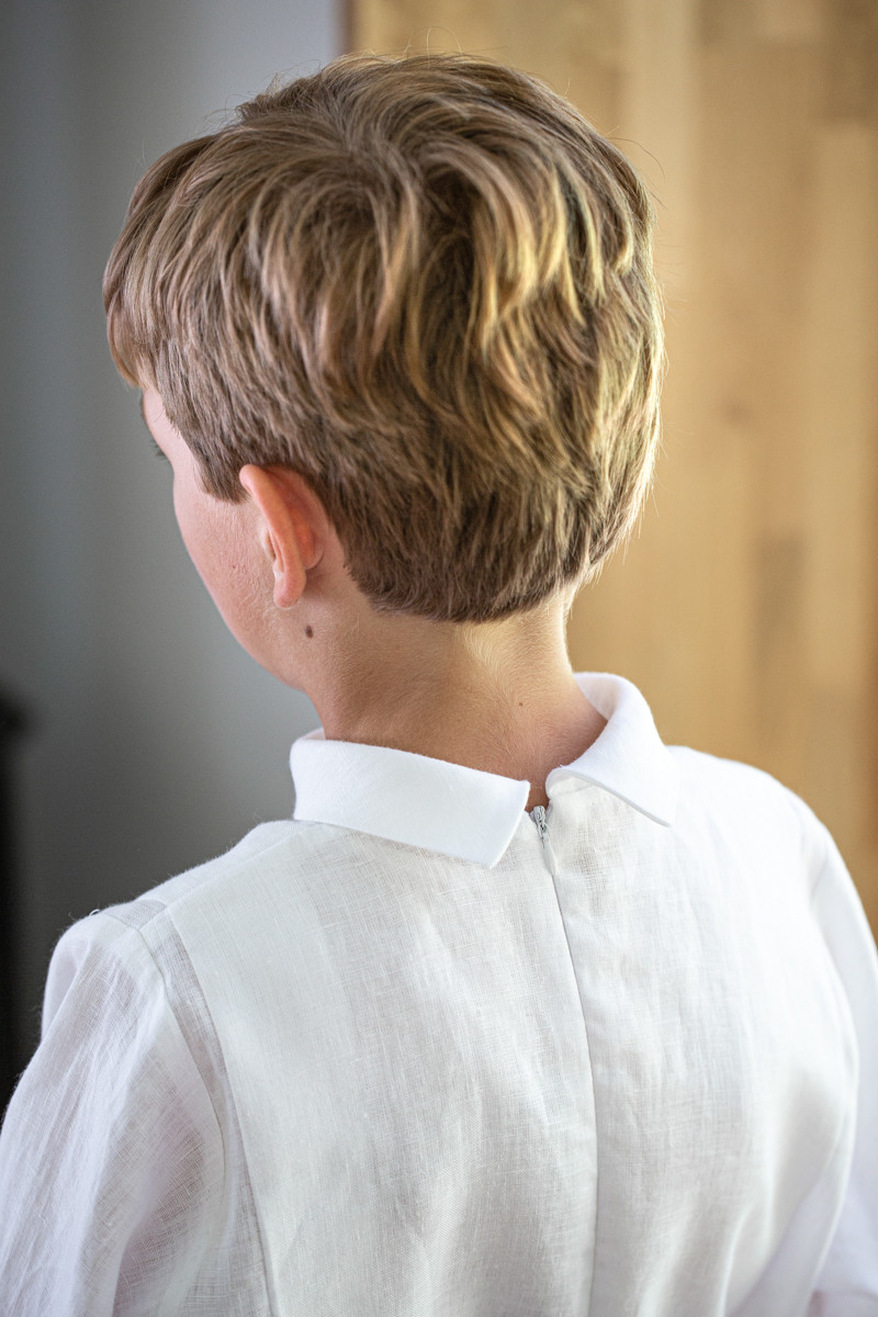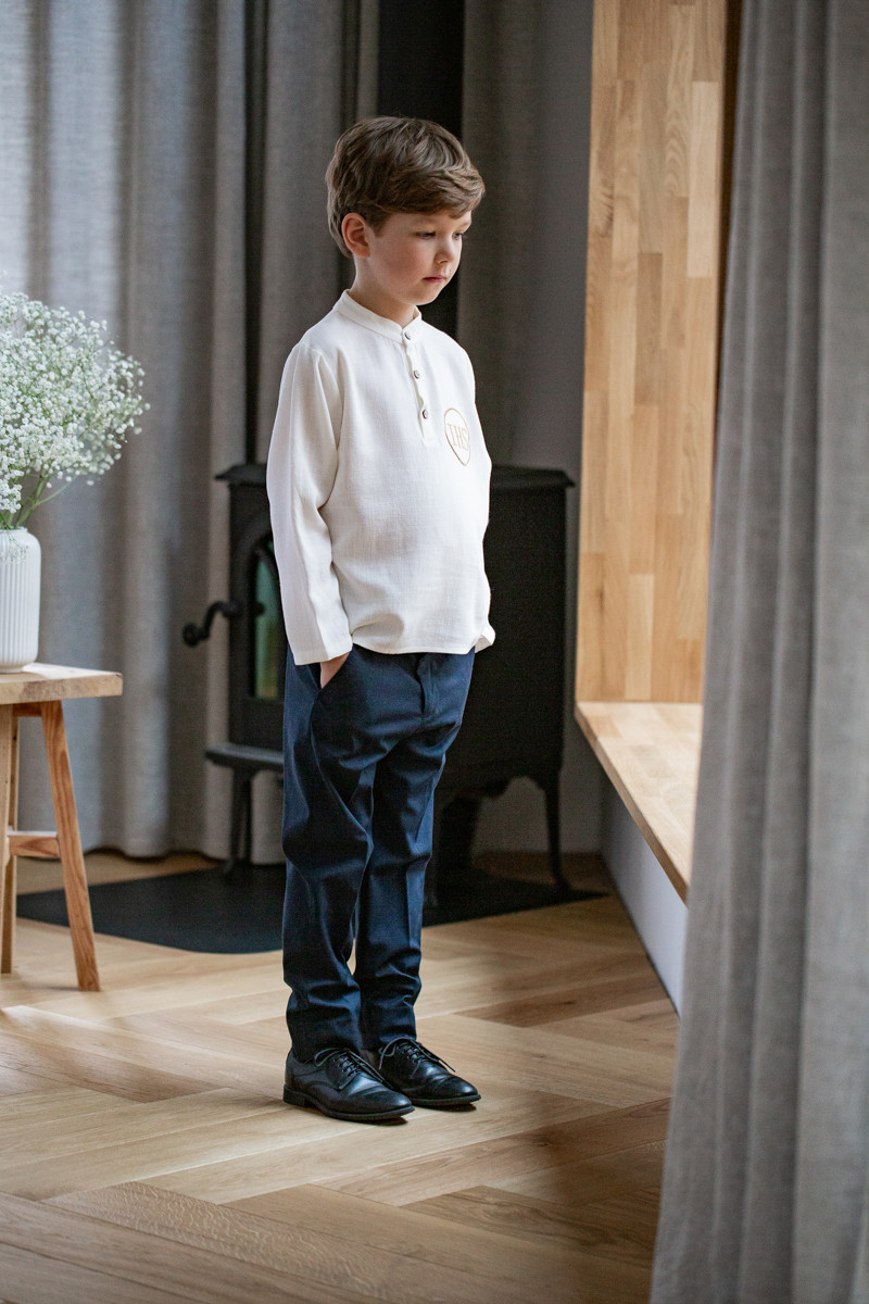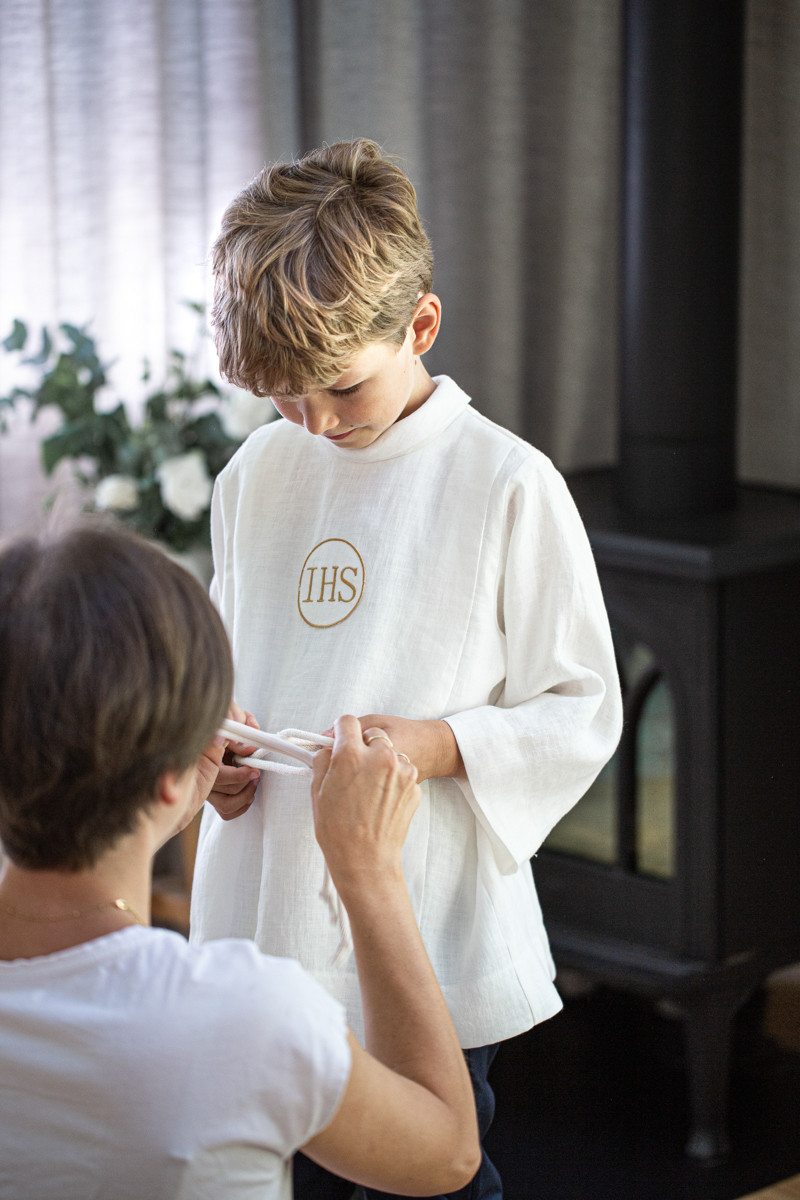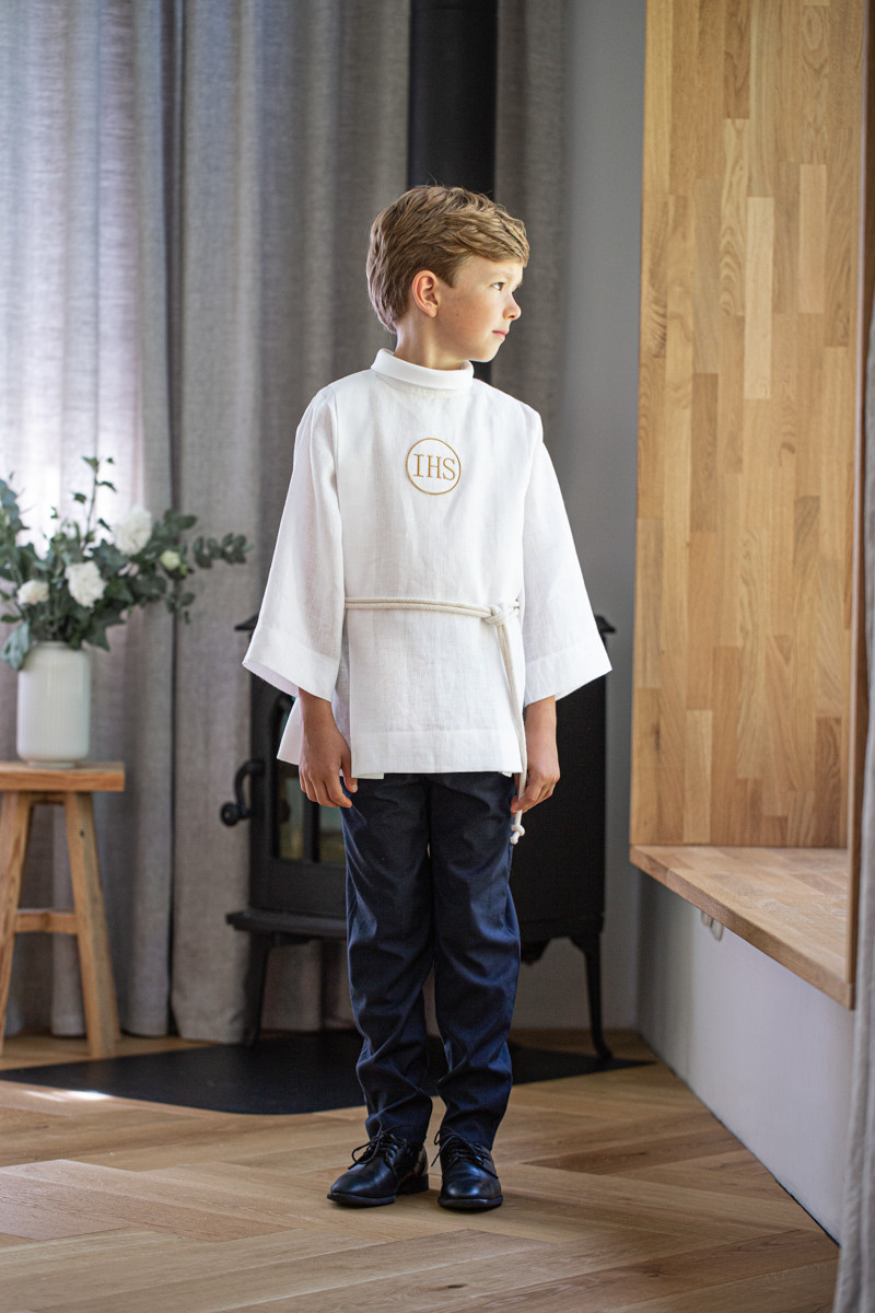 • jasny podkoszulek pod albę albo – w przypadku alby z poliestru – elegancka koszula (najlepiej bawełniana) z kołnierzykiem (jeśli zdecydujesz się na albę dla chłopców Lilen, nie ma potrzeby podkoszulka, ponieważ zamiast niego alby podszyte są wygodną podszewką),