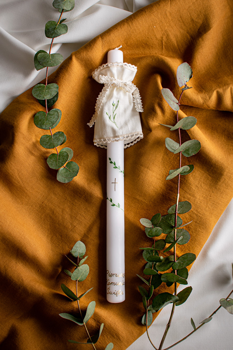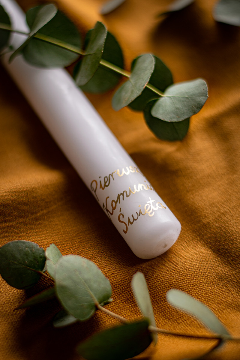 • świeca komunijna – możesz zamówić ją w wersji z imieniem dziecka, krzyżem lub innym delikatnym zdobieniem,