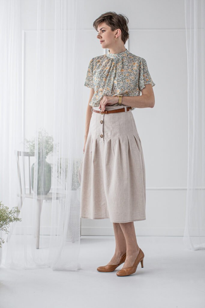 W takiej stylizacji na komunię świetnie sprawdzą się chociażby nasze Koszule damskie ze stójką Peony wraz ze spódnicami midi z wełny merino, dostępnymi w wielu wariantach kolorystycznych.