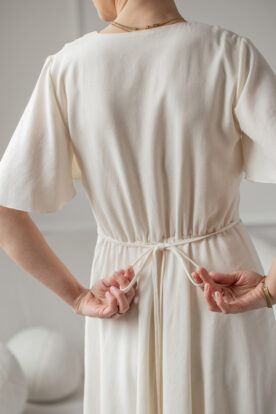 sukienka w stylu old money elegance jasny beż, długość midi dla mamy karmiącej, szyta ze skosu