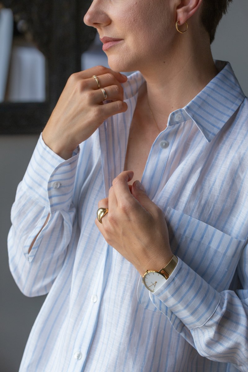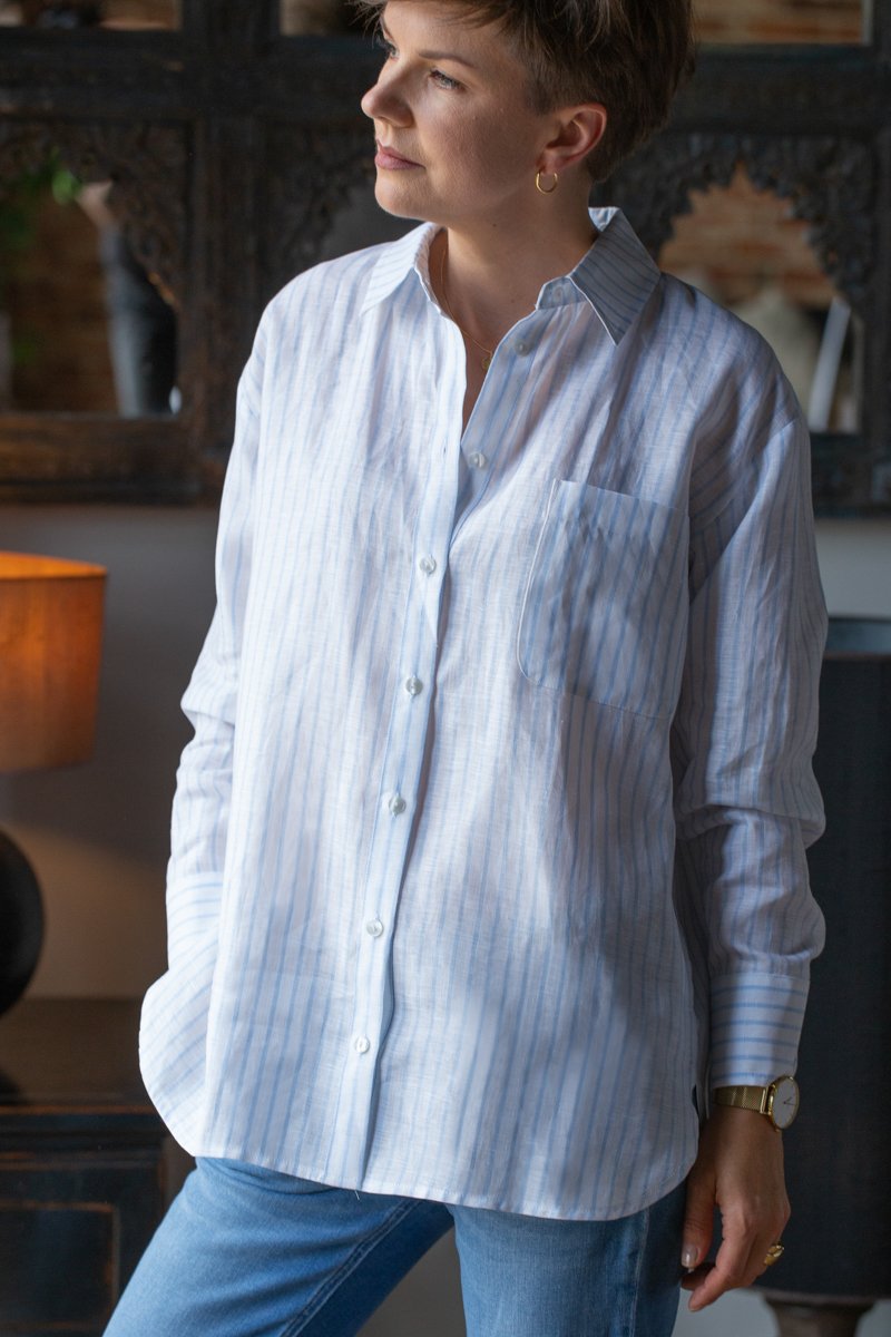 Ta niepowtarzalna koszula to wygoda i nonszalancki luksus w jednym. Lekki fason oversize, wzmocnione, nie podwijające się mankiety, precyzyjnie skrojony kołnierzyk i najlepszy polski len i deseń w niebieskie paski wspólnie tworzą wyjątkową ponadczasową koszulę wpisującą się w ponadczasowe trendy. Możesz nosić ją wpuszczoną w spodnie z podwiniętymi rękawami, możesz dodać do niej biżuterię i stworzyć biznesowy świeży look. Możesz też wypuścić ją swobodnie i cieszyć się lnianym komfortem podczas relaksu w domu czy na urlopie. Jedno jest pewne – będzie Twoją ulubioną towarzyszką, gdziekolwiek się znajdziesz.