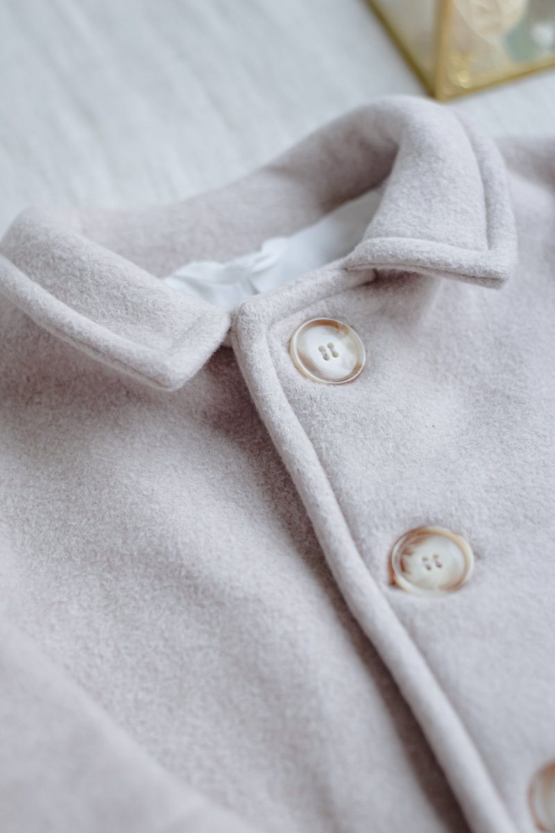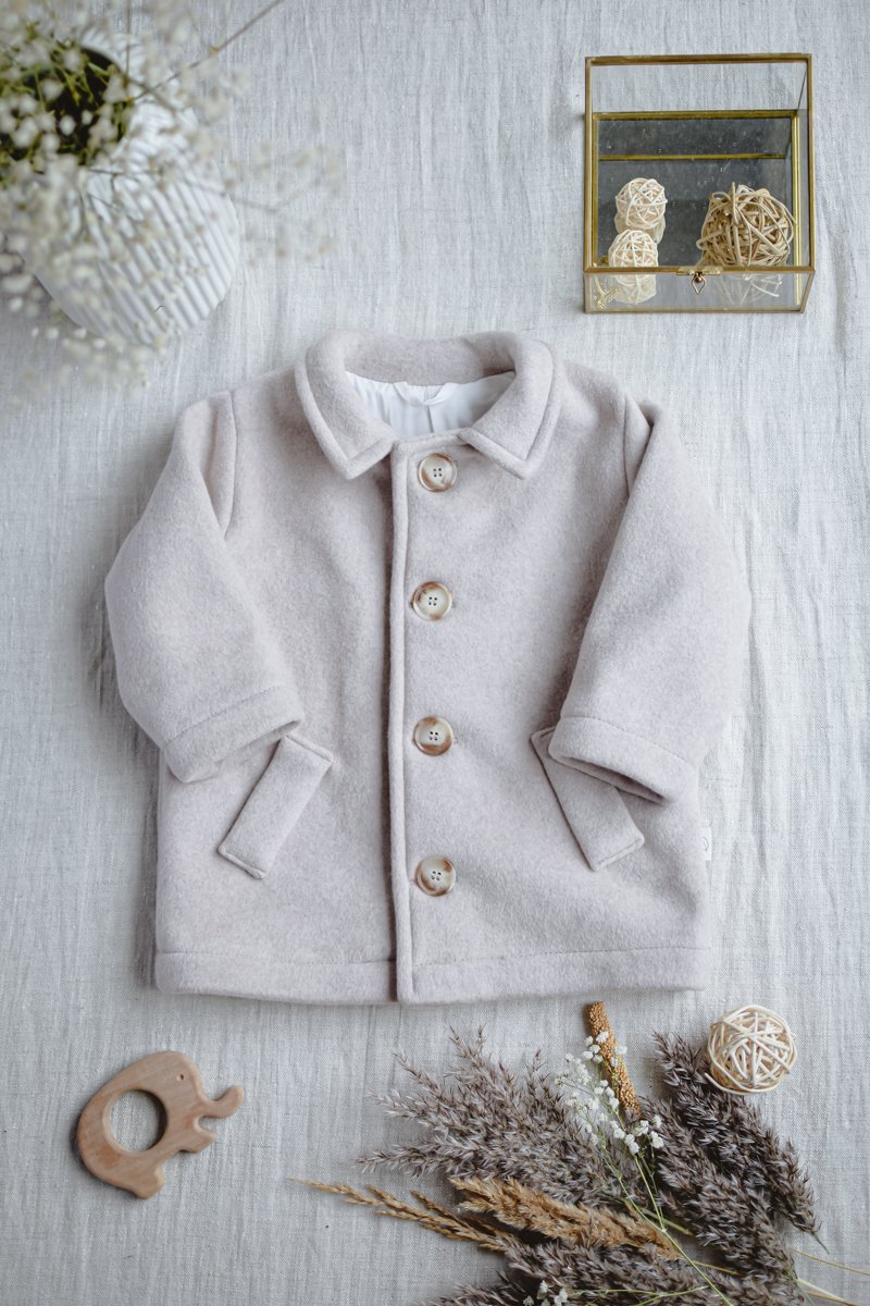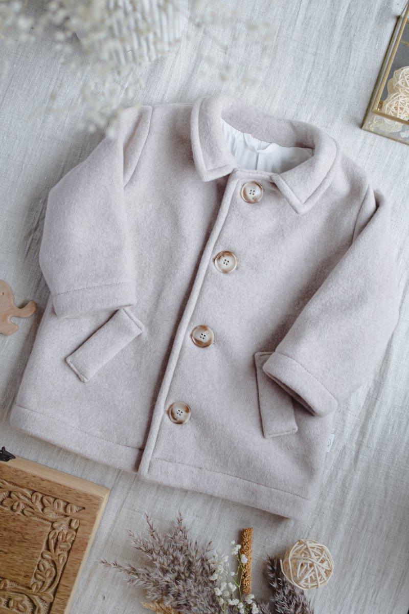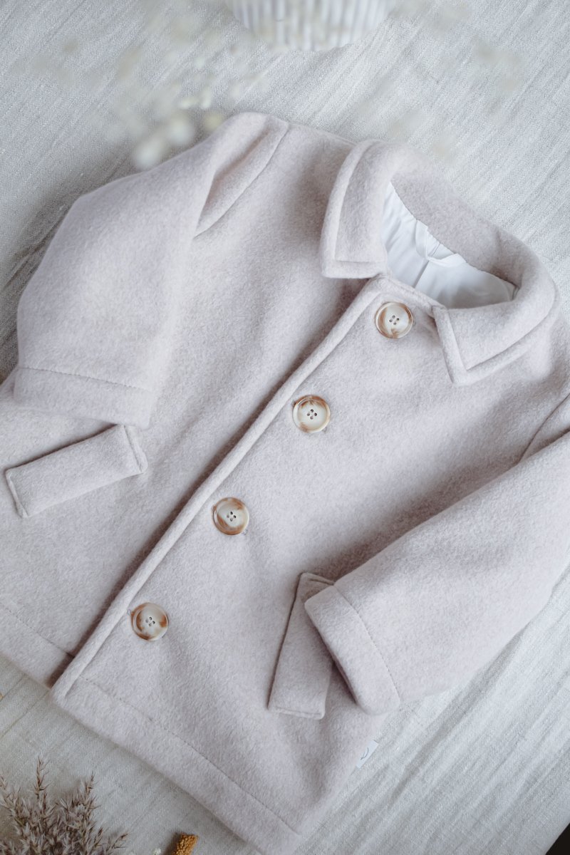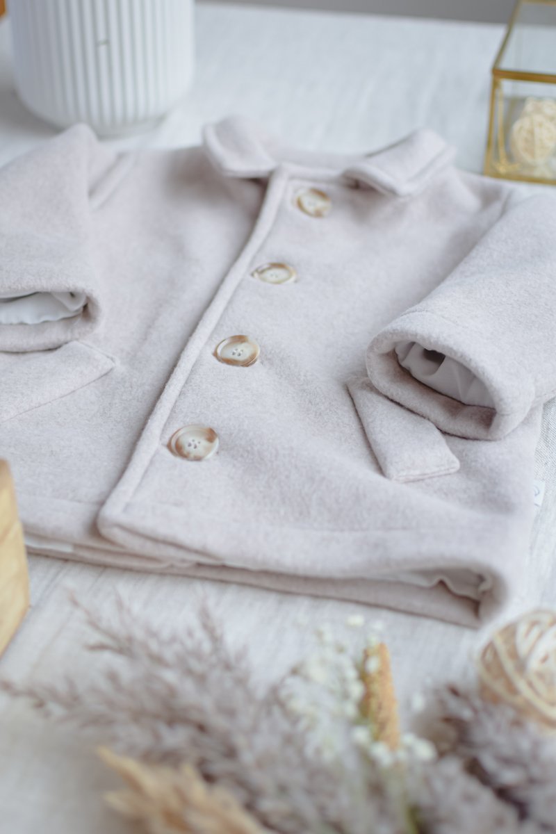 Otulająco miękki płaszczyk w delikatnym kolorze jasnego beżu wykonany z naturalnej certyfikowanej bawełny polarowej. Urzeknie Was od pierwszego dotknięcia!