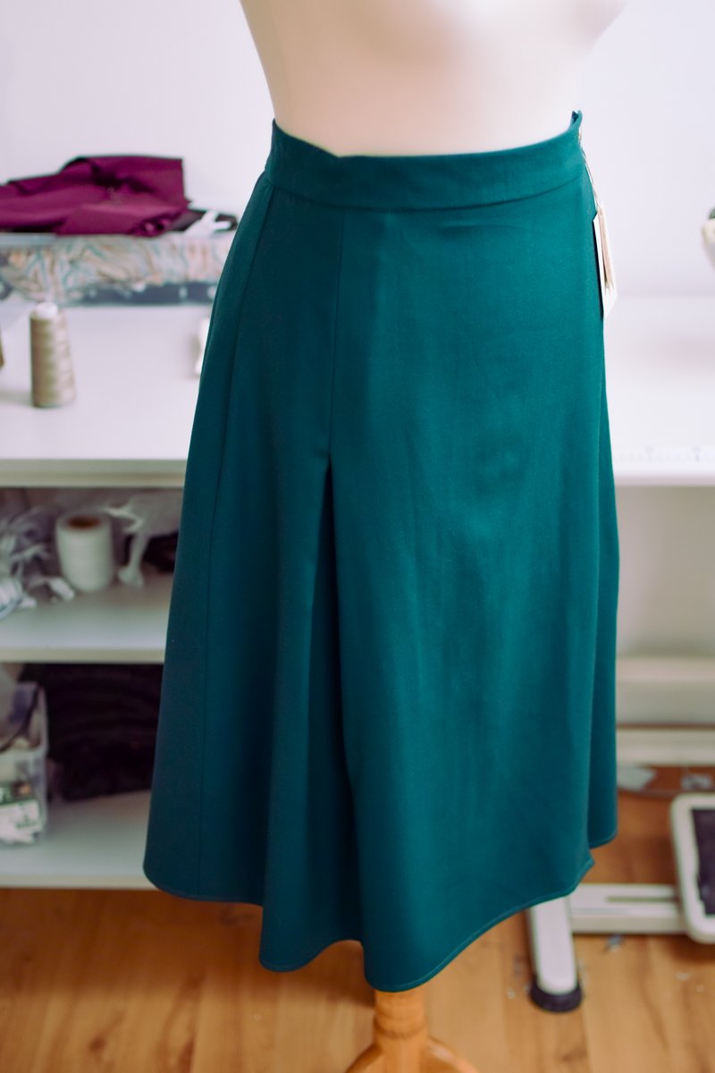 Piękna i elegancka spódnica trapezowa wykonana w 100% z wełny merino w kolorze butelkowej zieleni – II gatunek. Widoczne zagniecenia trudne do rozprasowania (zdjęcia). Dostępny rozmiar L.