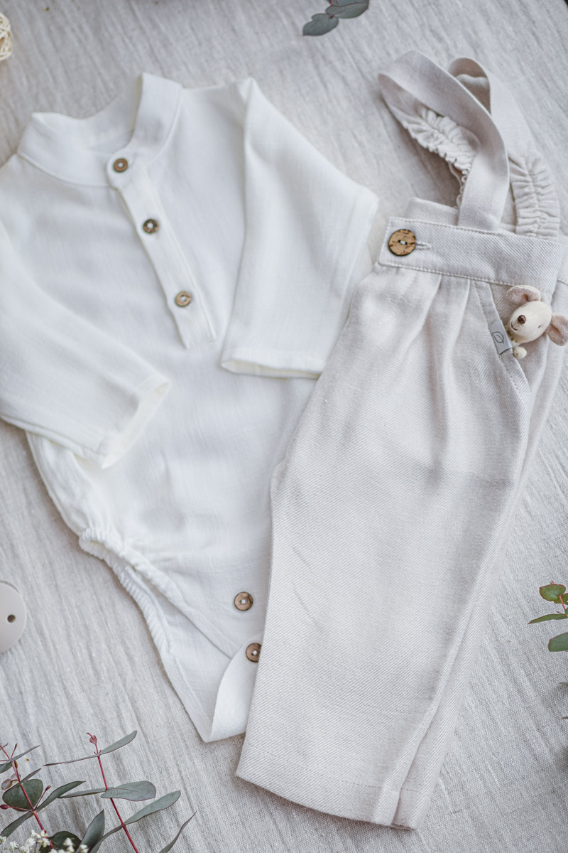 Body lub Koszula ze stójką: Wykonane z ultramiękkiej, oddychającej tkaniny lniano-wiskozowej. Stójka to idealne rozwiązanie dla niemowląt – w przeciwieństwie do klasycznego kołnierzyka, nie uwiera pod bródką i łagodnie układa się na klatce piersiowej, eksponując buzię dziecka.