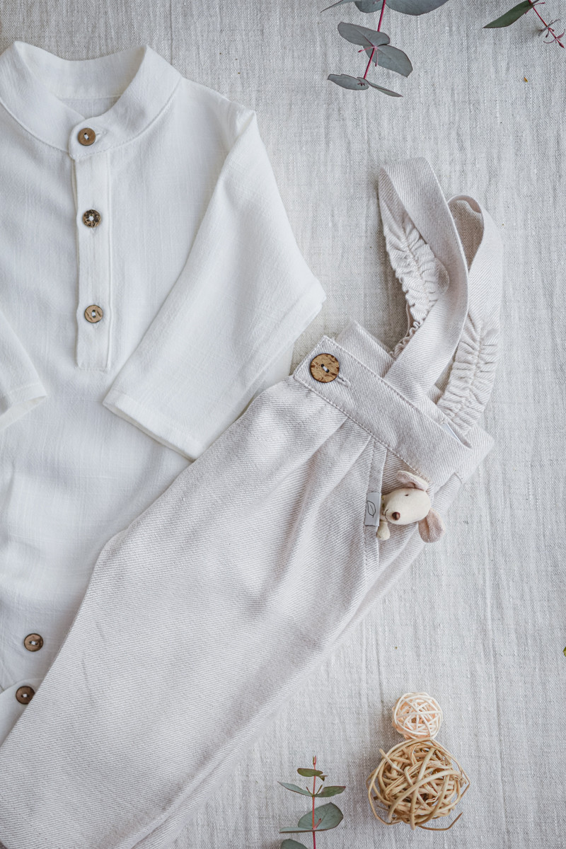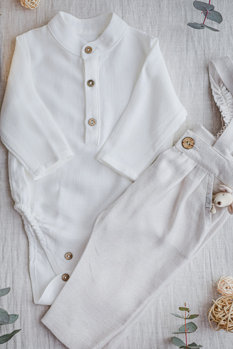 - Rzemieślnicza jakość i detale Naturalne guziczki z włókna kokosowego oraz staranne, polskie wykończenie sprawiają, że komplet prezentuje się szlachetnie i skromnie. Brak sztywnych elementów i drażniących szwów to nasz priorytet przy projektowaniu ubranek dla niemowląt.